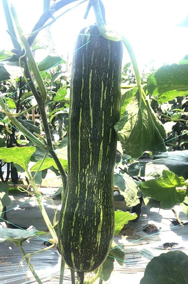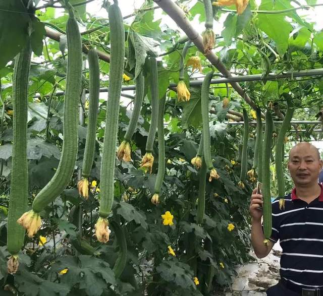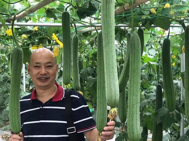 ▲ 客戶在展示“三比6號(hào)”絲瓜,